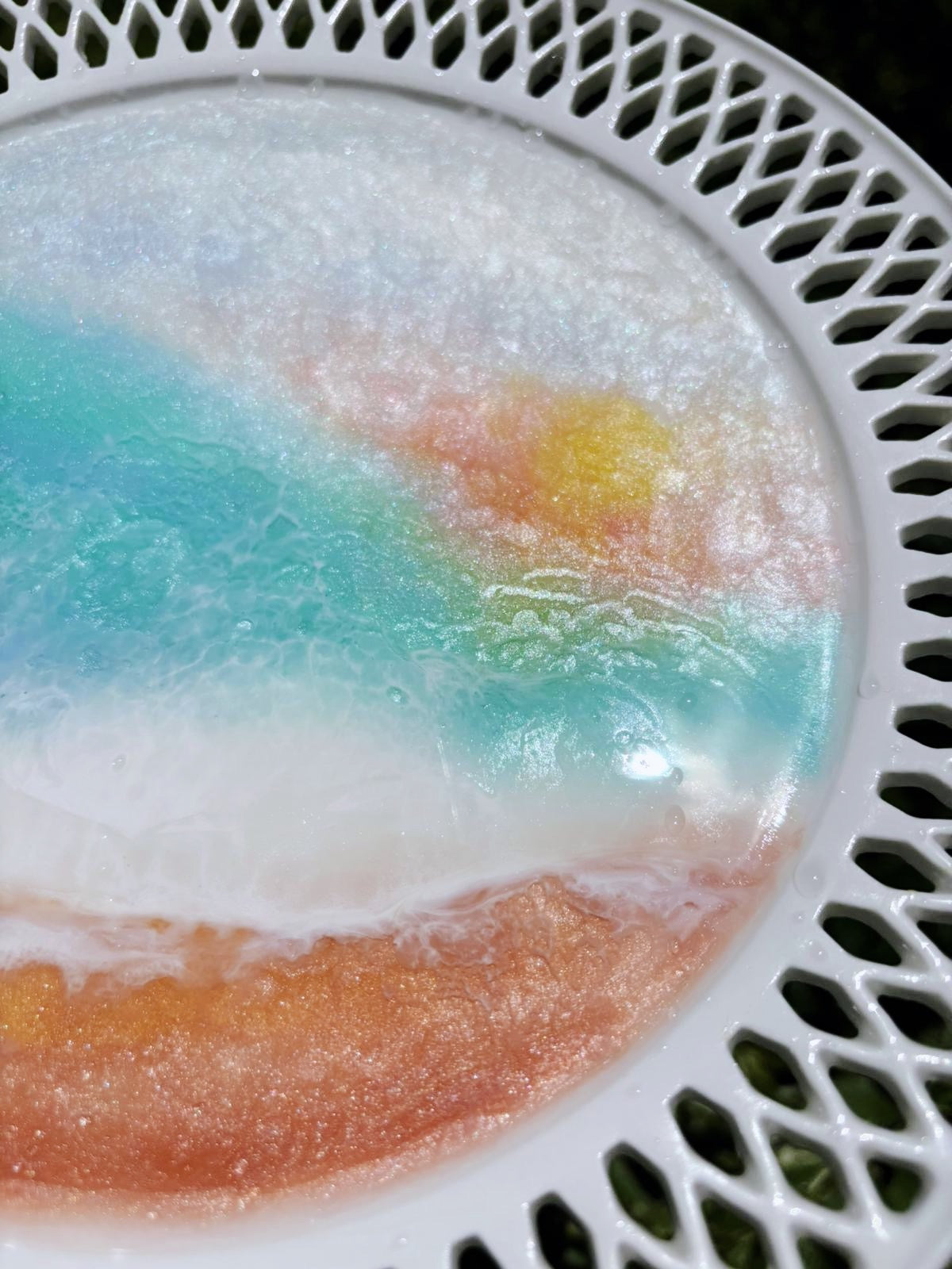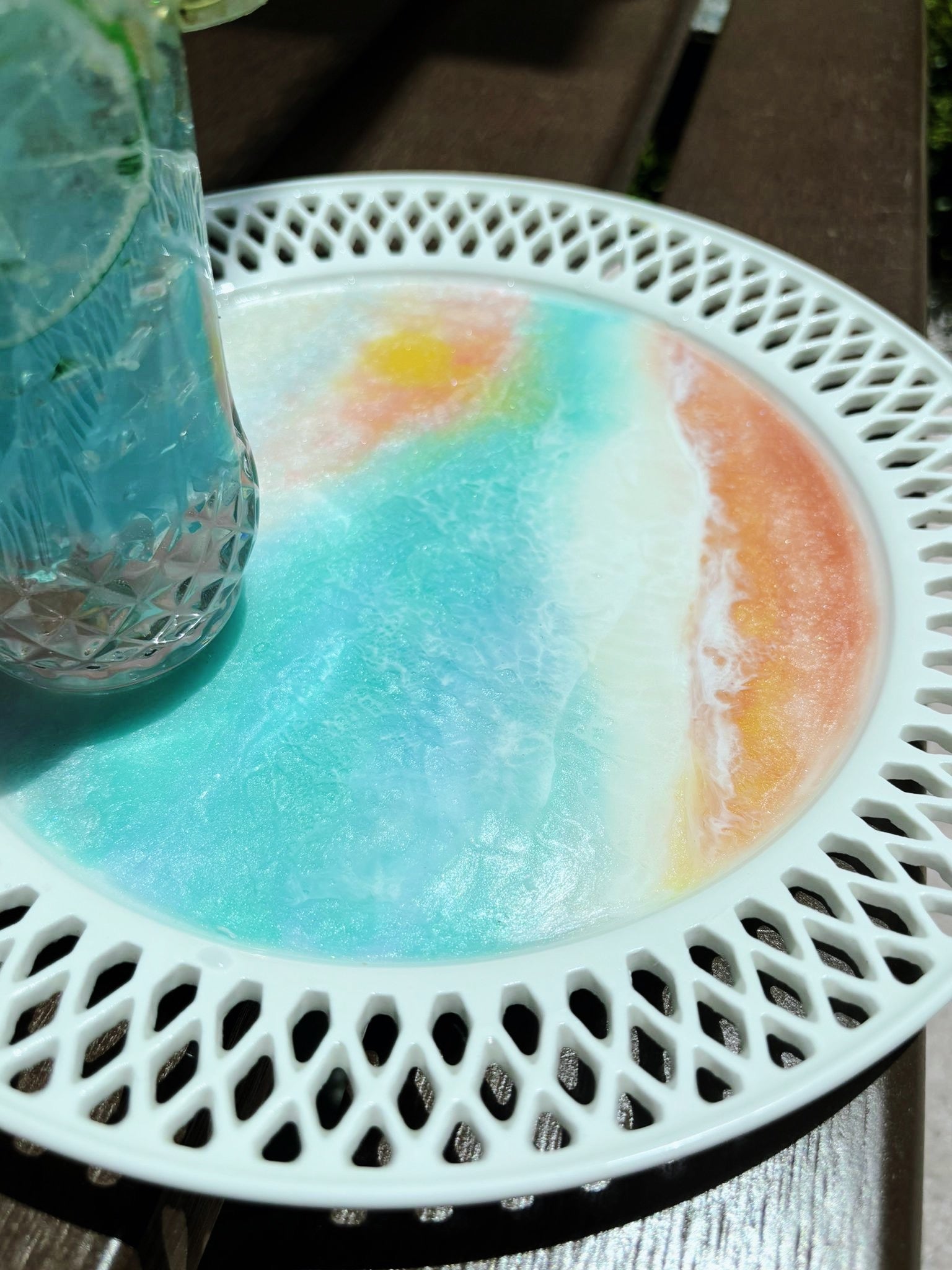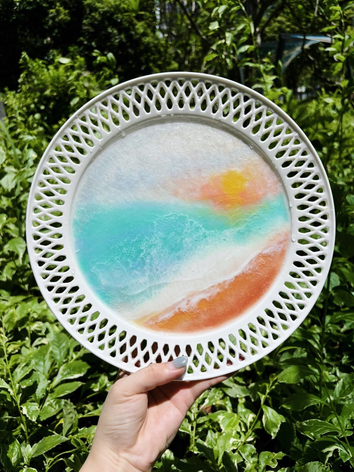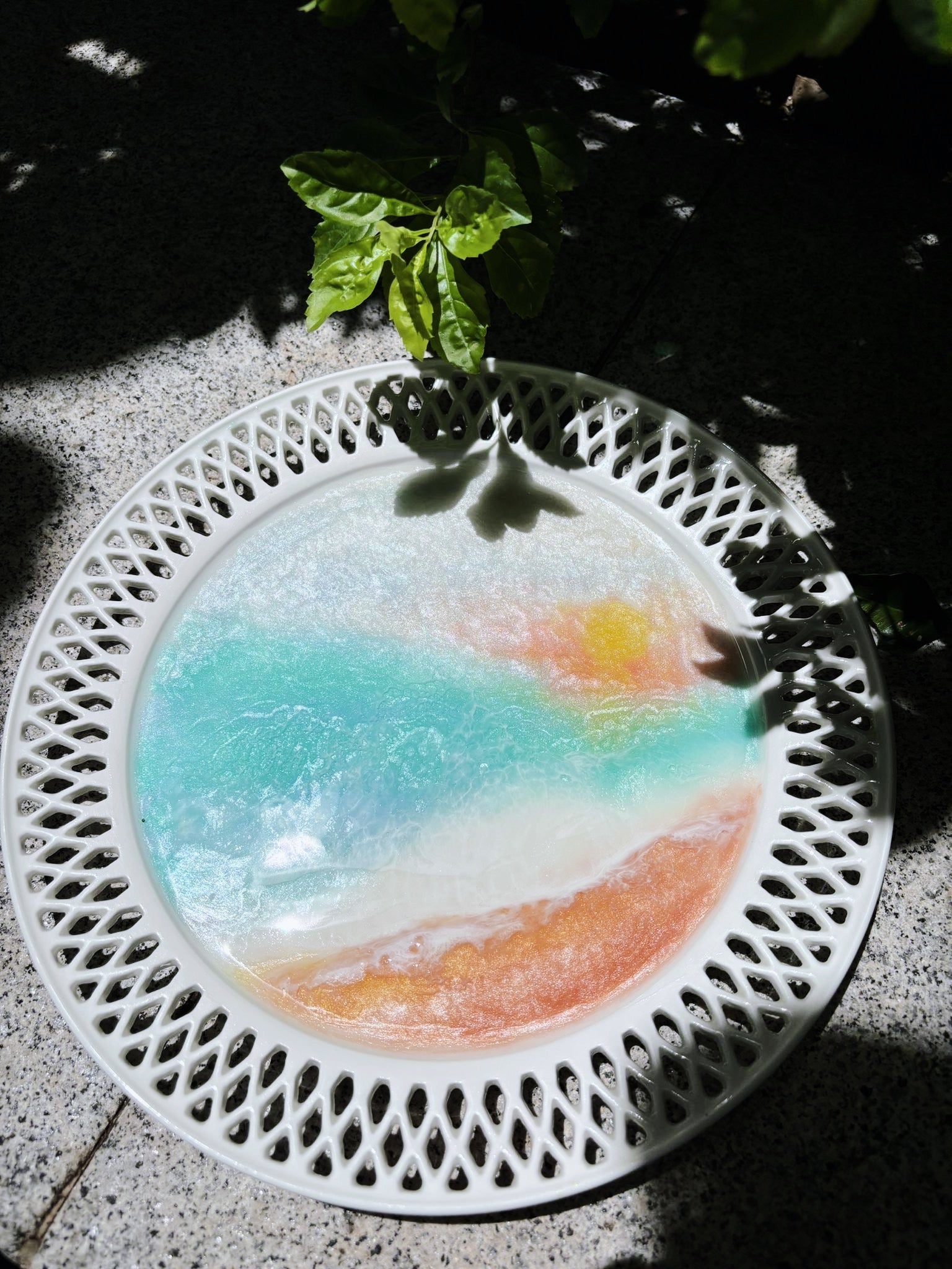 用環氧樹脂直接在陶瓷碟上創作了一幅夕陽的海潮作品。難忘的是太陽的光影部分和雲彩的融合。整體的感覺是被溫柔的顏色包圍,形成了一個舒服療愈的作品。