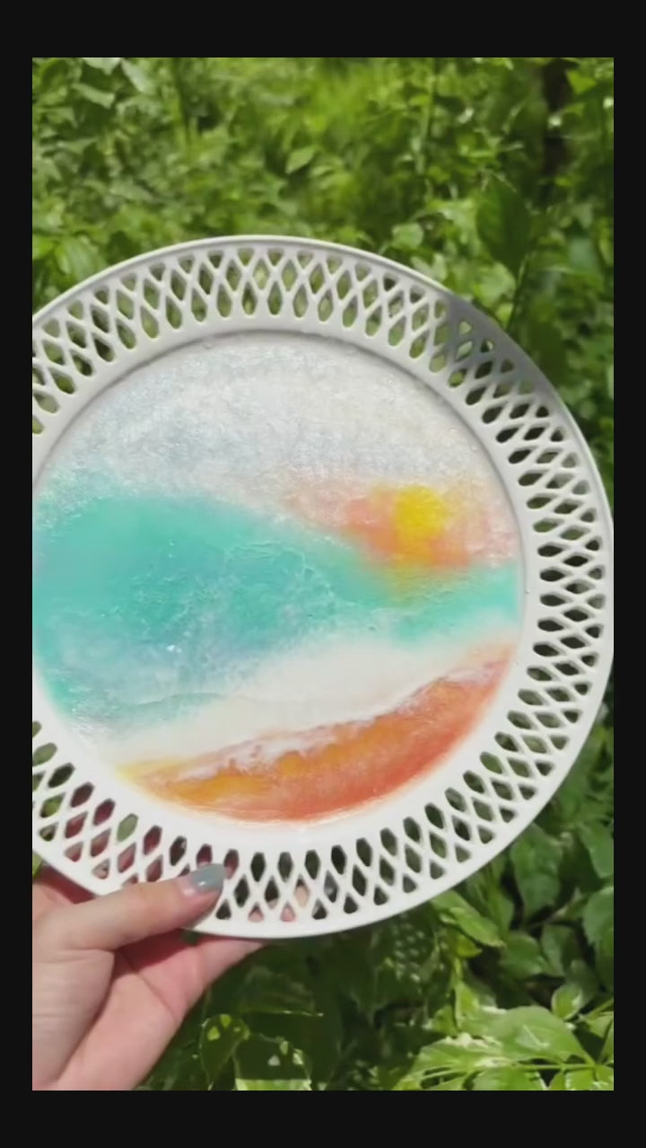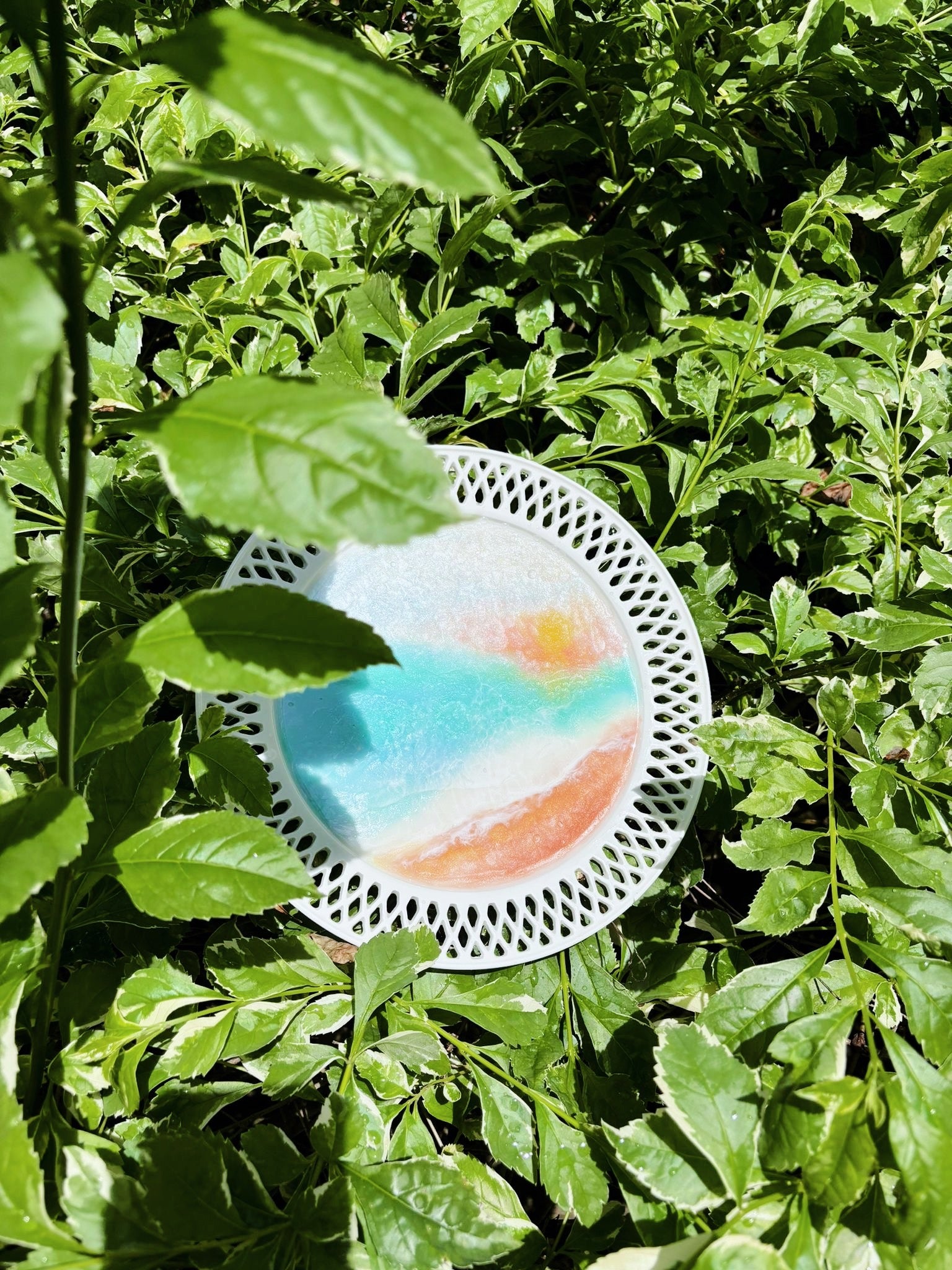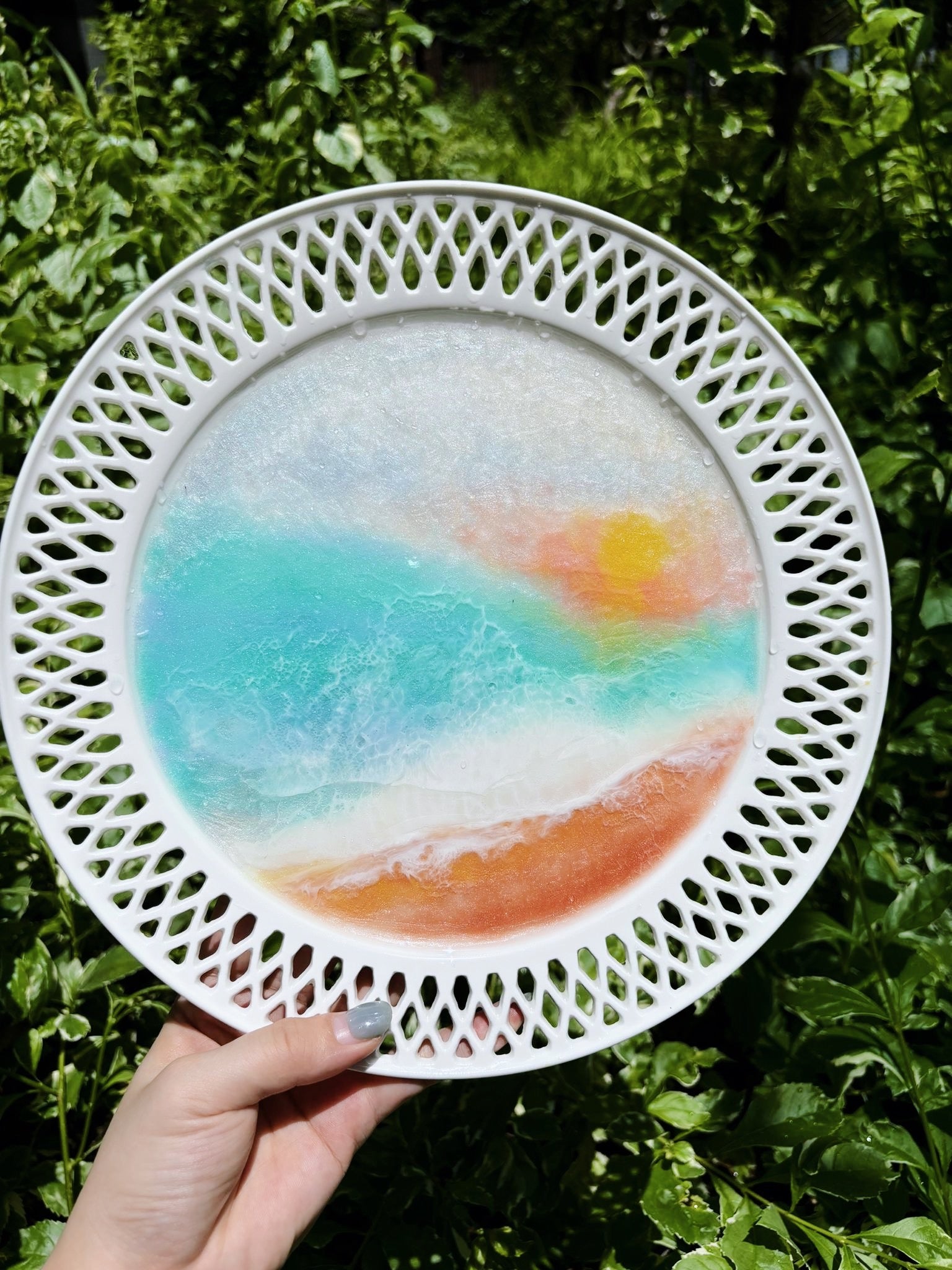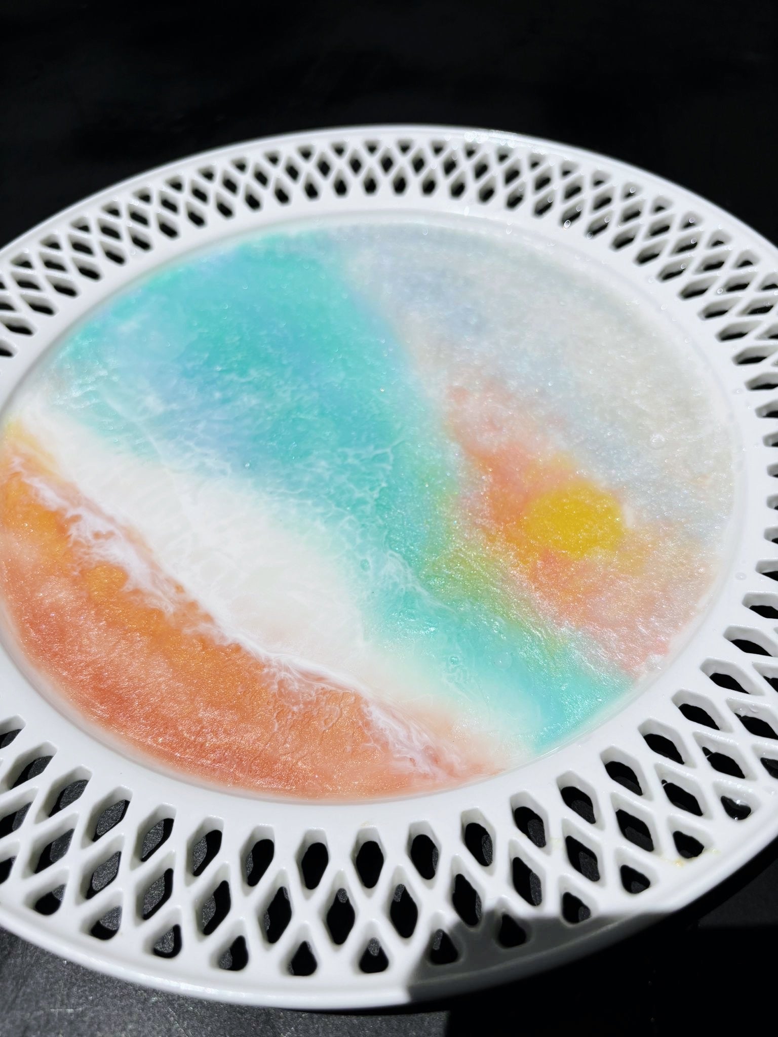 用環氧樹脂直接在陶瓷碟上創作了一幅夕陽的海潮作品。難忘的是太陽的光影部分和雲彩的融合。整體的感覺是被溫柔的顏色包圍,形成了一個舒服療愈的作品。