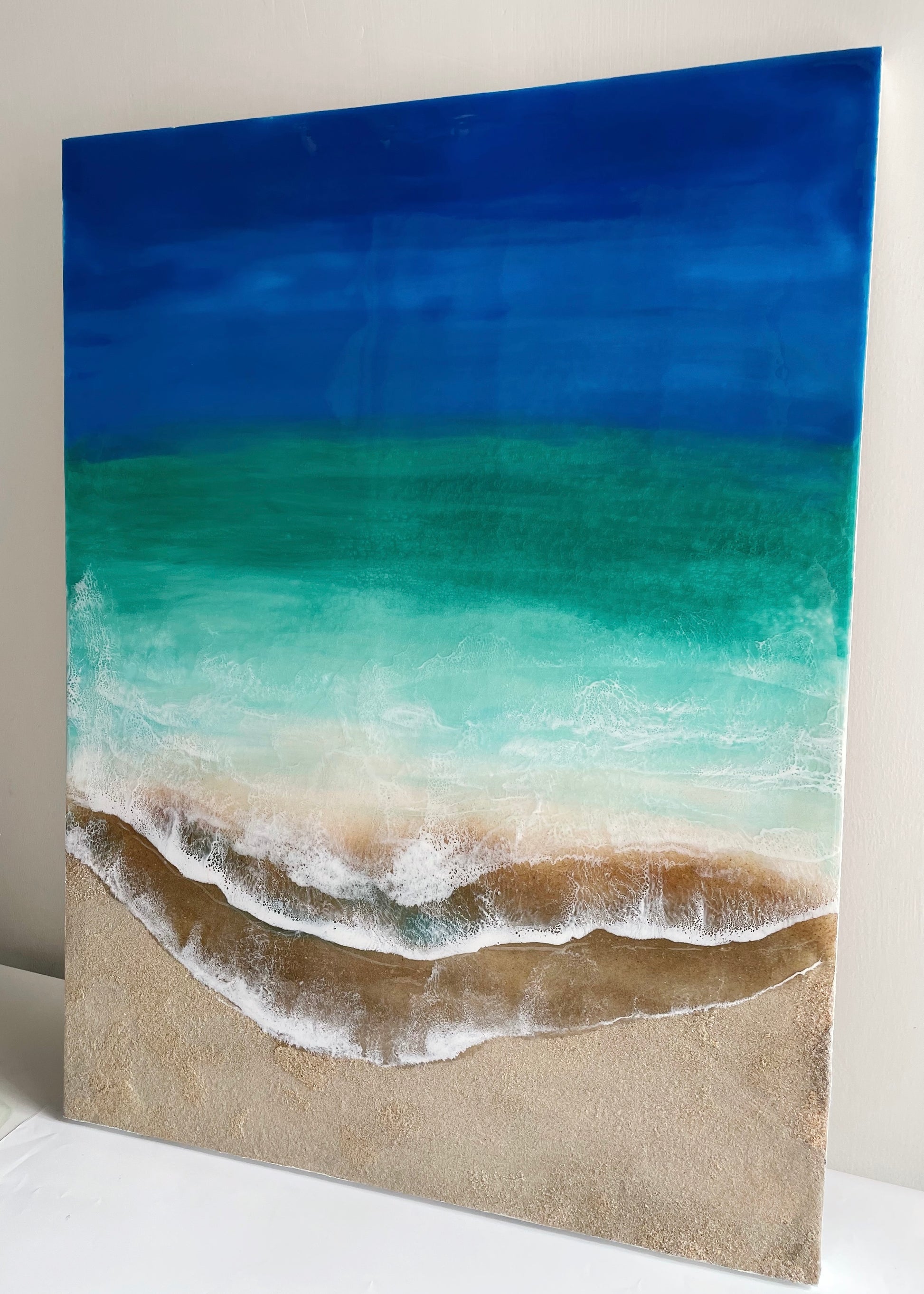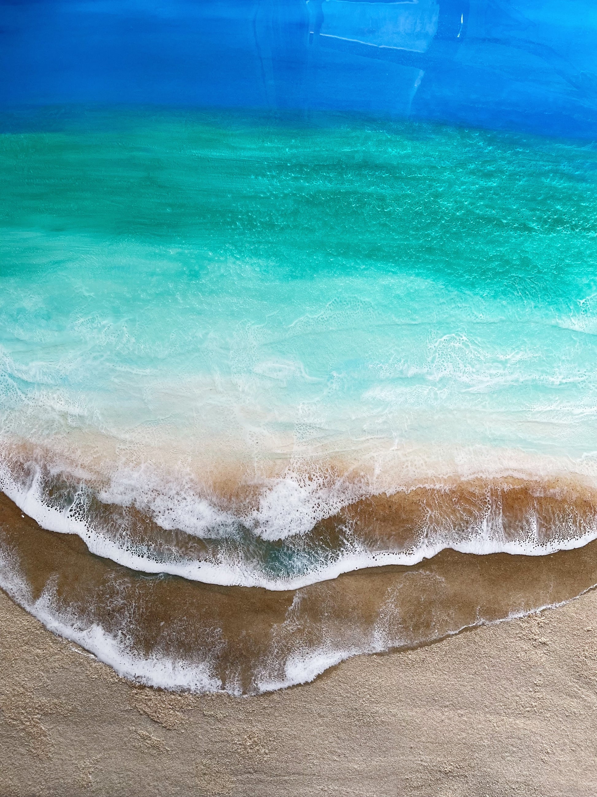Bring the calming ocean into your home or restaurant with our "Calm Ocean Canva." Immerse yourself in the tranquil blues and greens while enjoying a meal or a cup of coffee. Each unique canvas is hand-crafted by Vicky.